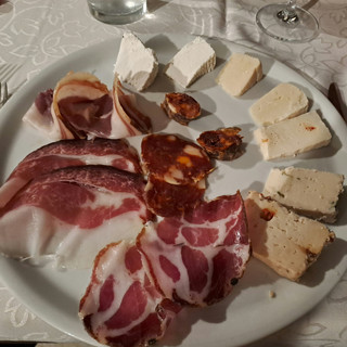 Wurst und Käse aus eigener Herstellung. Fleisch- und Wurstwaren vom Suine Nero, Nudeln mit Kürbisblüten und dann natürlich das Schwein als Hauptgang. Zum Schluß brachte mir der Chef einen selbstgemachten Schnapps.