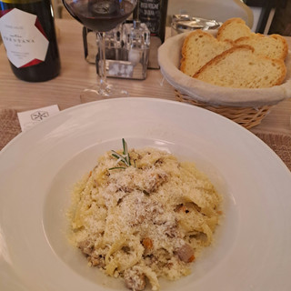 Tatar mit Trüffel, Nudeln mit Entensoße und danach leicht gebratene Rinderscheibchen mit einer Flasche Montepulciano. Das Überleben so einer Regenfahrt musste gefeiert werden!